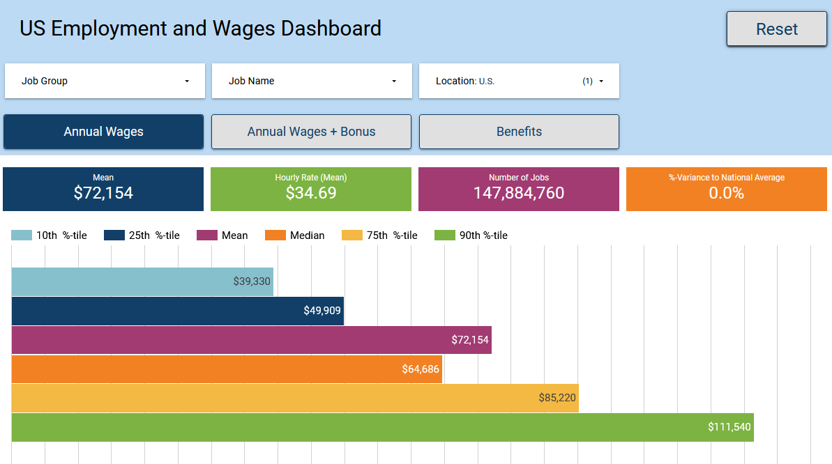 All Occupations: Obtain comprehensive wage, employment, and benefits data for over 800 occupations within the United States, empowering precise salary benchmarks and deeper insights into related job roles and occupations.